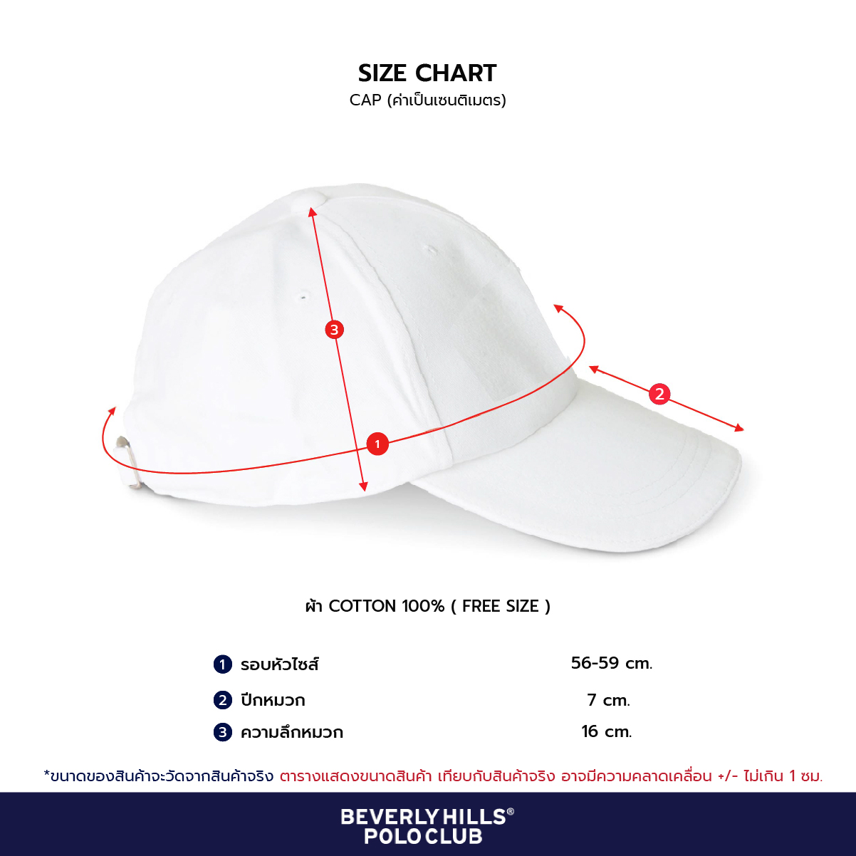 - ด้านหน้าหมวกปักคำว่า "Beverly Hills Polo Club" ที่เป็นเอกลักษณ์เฉพาะตัวของแบรนด์