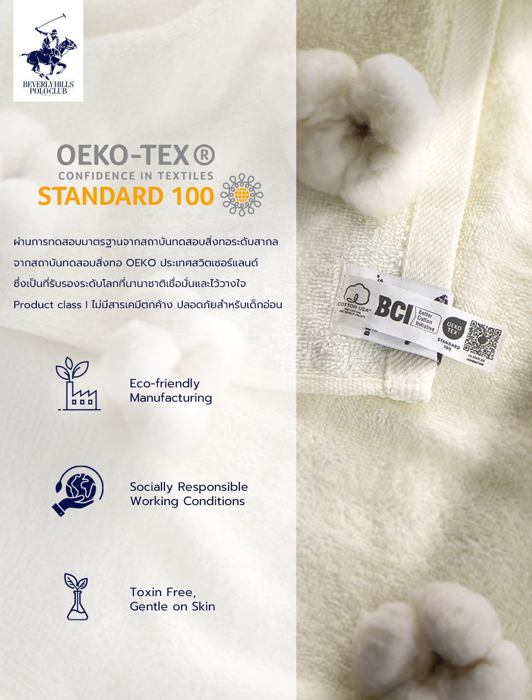 ผลิตภัณฑ์ของเราผ่านการทดสอบมาตราฐาน OEKO TEX STANDARD 100 จากสถาบันทดสอบสิ่งทอ OEKO ประเทศสวิตเซอร์แลนด์ ซึ่งเป็นที่รับรองระดับโลกที่นานาชาติเชื่อมั่นและไว้วางใจ เพื่อให้ลูกค้าของเรามั่นใจได้ว่าผลิตภัณฑ์ของเราปลอดภัยจากสารเคมีอันตรายต่างๆ ที่ส่งผลต่อผู้ใช้งาน มาพร้อมกับกล่องที่สวยงาม เหมาะสำหรับซื้อเป็นของขวัญในทุกเทศกาลหรือจะซื้อใช้เองก็คุ้มสุดๆ